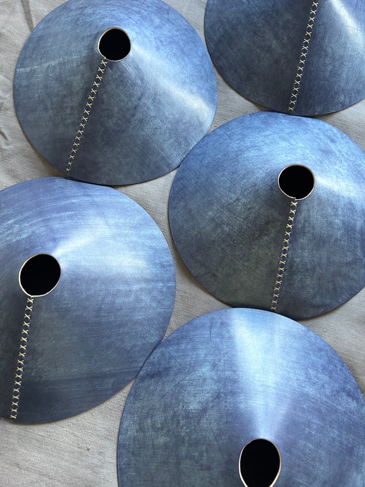 Handmade leather pendant lampshade in blue muscat bloom leather sourced locally and crafted by us in our workshop