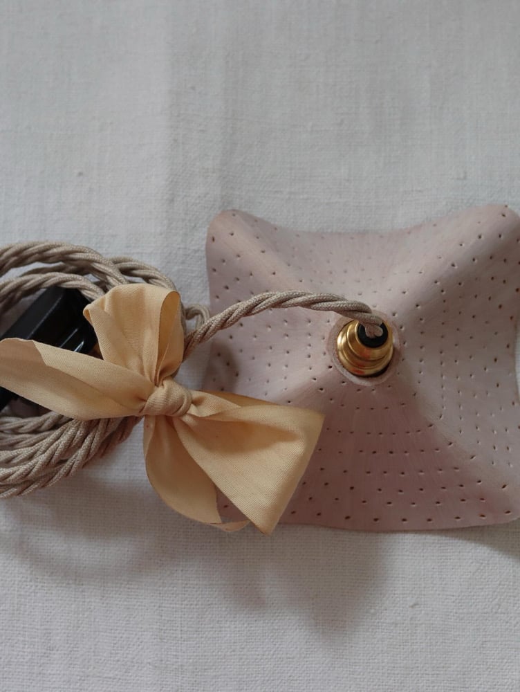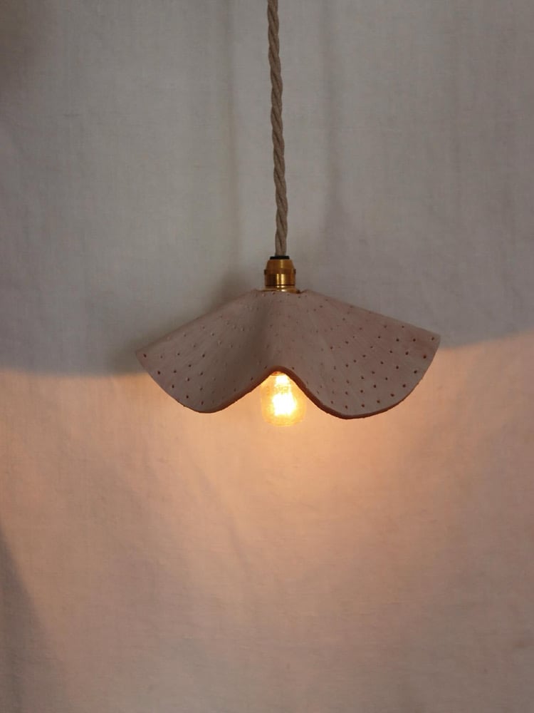 Small sculptural leather pierced and washed with a white finish pendant measuring 15cm x 10cm